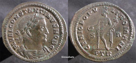 #8) Treveri (Trier) mint, A.D. 307 RIC 693b Obv: FL VAL CONSTANTINVS NOB C Rev: GENIO POPV-LI ROMANI - Genius, towered, with loins draped, holding patera and cornucopiae. PTR in exergue; S in left field, A in right. 29 x 27 mm, 6.9 g.